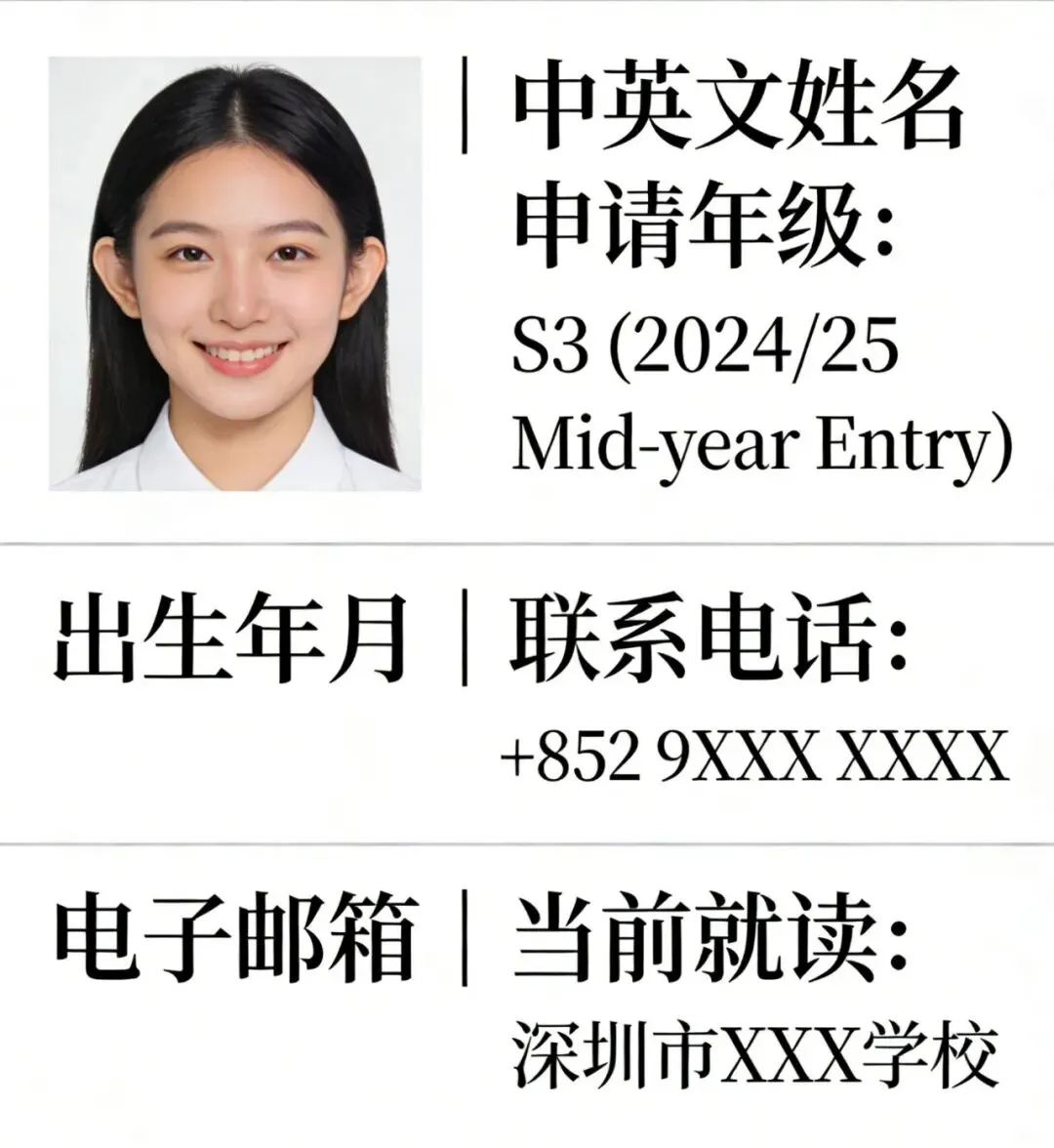 ————————————————————————— | [护照规格证件照:白底、露耳、微笑] | 中英文姓名 | 申请年级:S3 (2024/25 Mid-year Entry) | | 出生年月 | 联系电话:+852 9XXX XXXX | | 电子邮箱 | 当前就读:深圳市XXX学校 —————————————————————————