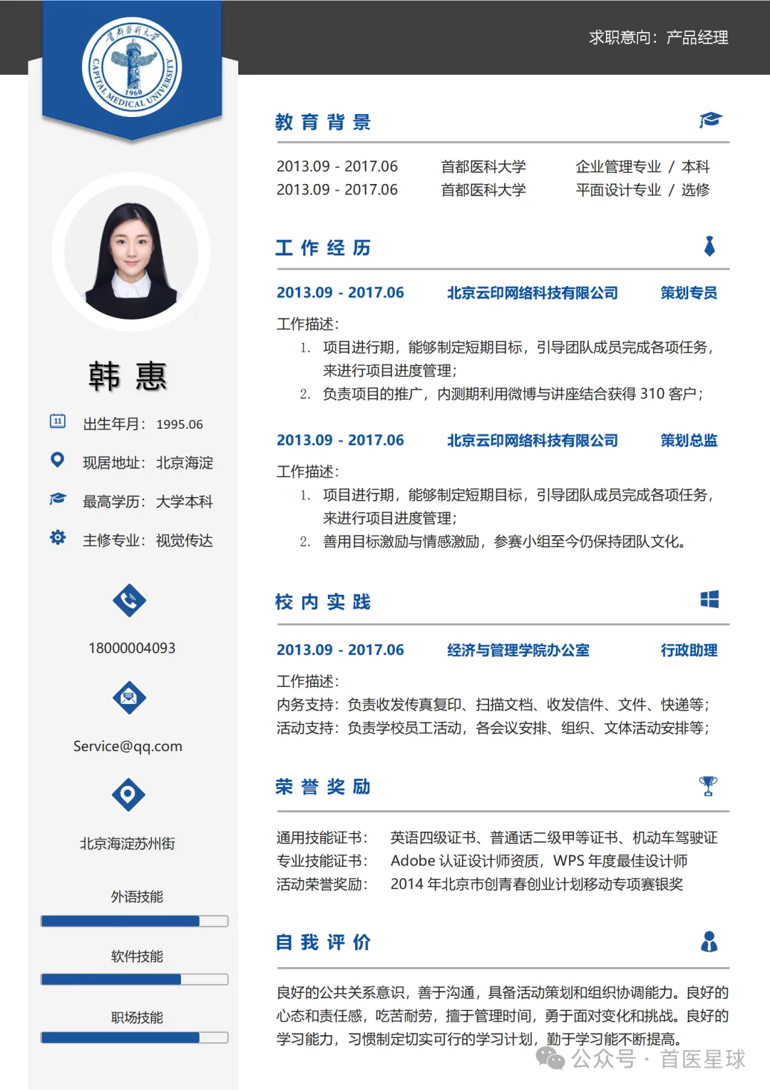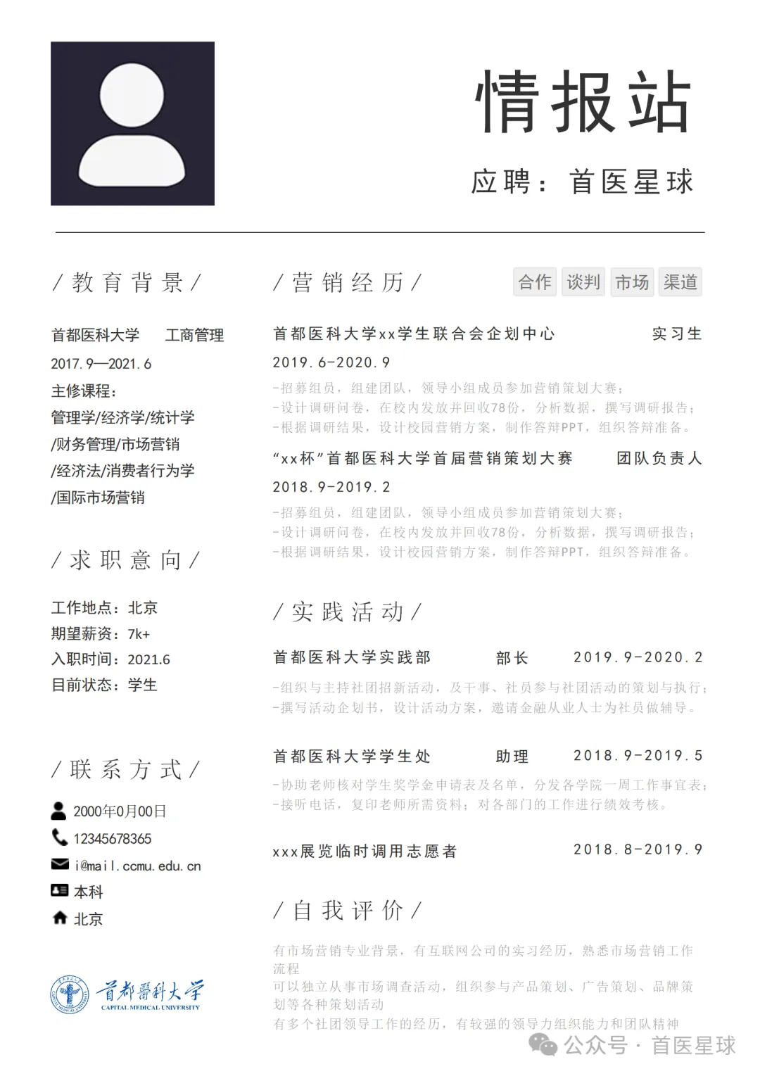 首都医科大学简历模板
