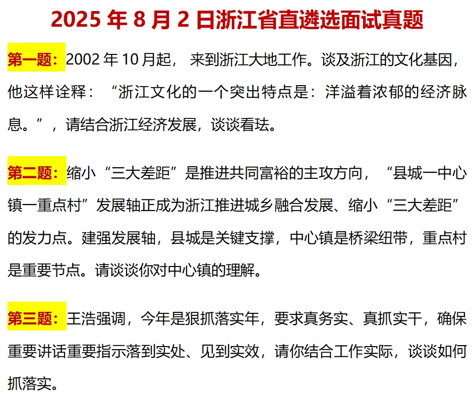 2.紧密结合“浙江实际”所有问题都扎根浙江,比如让你谈浙江的文化经济特点、浙江的“中心镇”、浙江重要领导人的讲话,核心就是看你能不能把工作和浙江的发展大局结合起来,做到“从浙江实际出发,为浙江发展出力”。