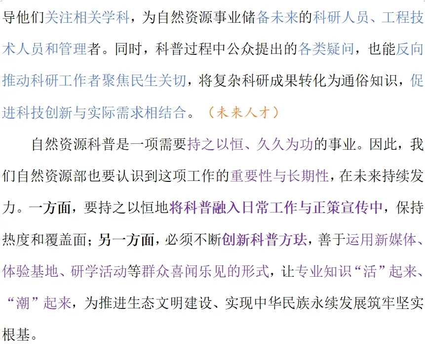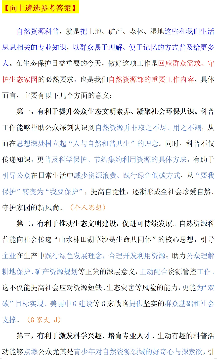 师兄今天重点给大家讲一下第一题,这种题目看似简单,但非常能凸显格局,我给大家梳理出作答思路并给一版作答示范!题目:结合自身认识和理解,谈谈自然资源科普的意义【作答思路】