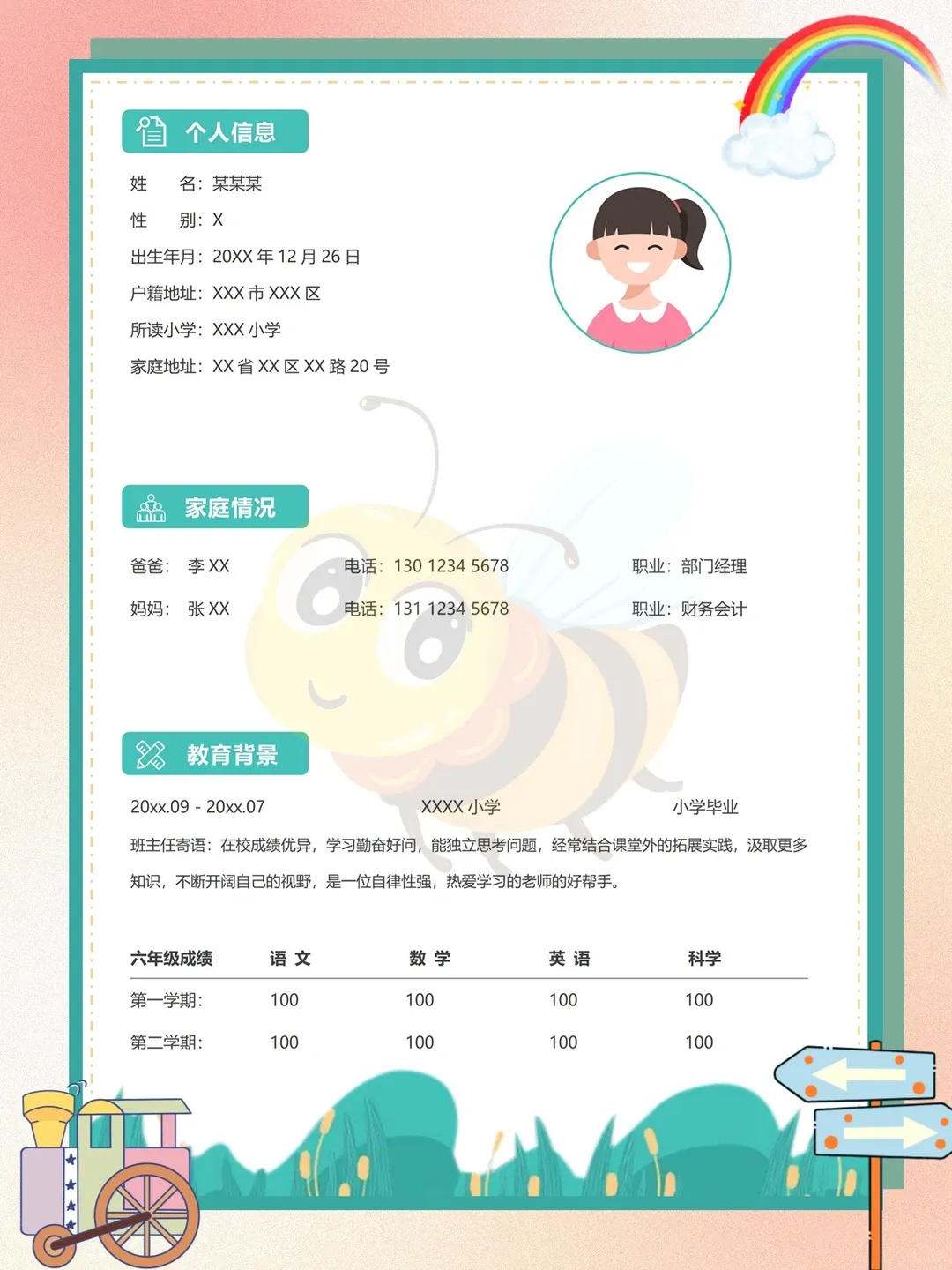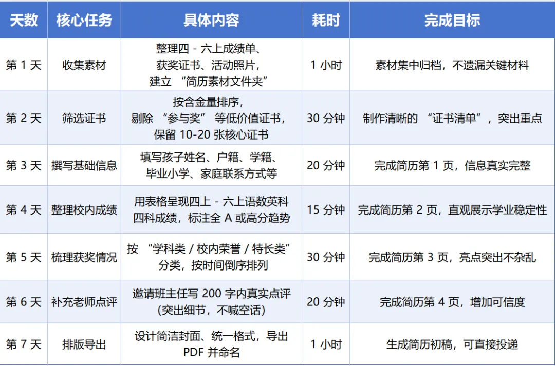 ● 格式:导出为 PDF(避免排版错乱),命名格式 “姓名_毕业小学_小升初简历.pdf”