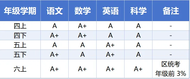 ● 重点:突出 “四 - 六上全 A”“区统考年级前 5%” 等亮点,有进步趋势也可标注(如 “五下数学 B→六上 A”)