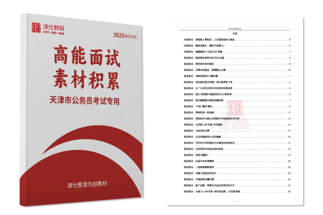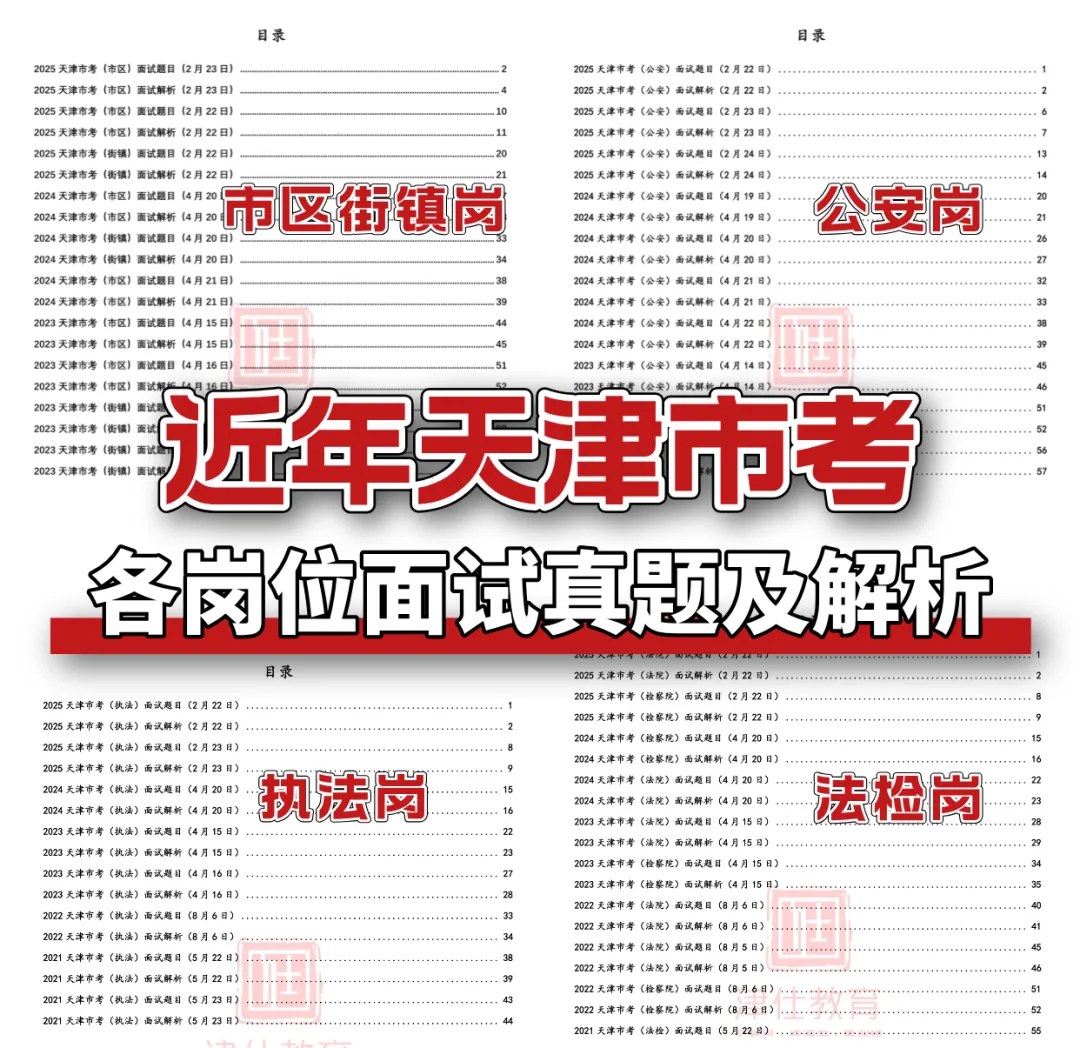 天津市考面试是分岗位分类面试的,所以同学们在备考面试的时候一定要先了解清楚自己岗位的面试形式,针对性备考!为帮助各位同学备考顺利,津仕教育特为各位同学整理了天津市考面试备考全套资料包,内含天津市考近五年各岗位面试真题及解析,文末可免费领取!