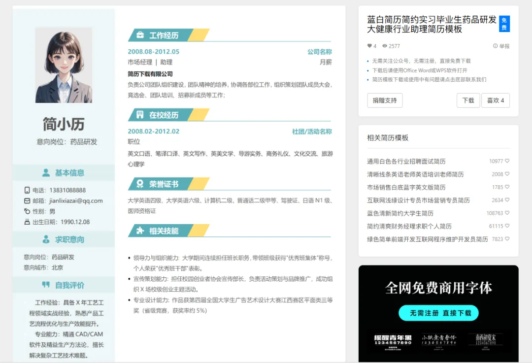 - 模板免费无套路:全场简历模板0收费,没有隐藏付费项,下载按钮大到生怕你看不见