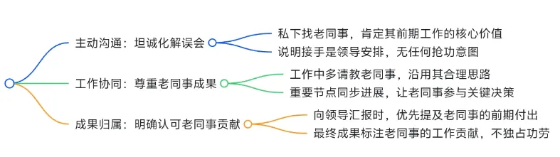 在工作开展过程中,我会主动向老同事请教,认真学习他前期的工作思路和方法,对他已经完成的内容进行充分衔接,不随意更改;遇到问题及时与他沟通,重要工作节点主动向他同步进展,让他感受到被尊重、被重视。