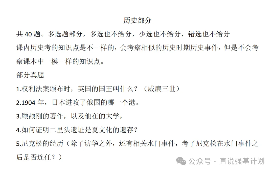 数学:接近数学联赛一试难度,侧重数论、不等式、数列、平面几何等竞赛基础内容物理:包含竞赛内容,五选项不定项选择题难度大,少选得 2 分,错选不得分,对知识准确性要求高化学:高考 + 初赛难度,题量大(50 题),侧重基础知识和应用能力语文 / 历史:学术性强,考查深度阅读与批判性思维能力四、面试考情与真题分类精解