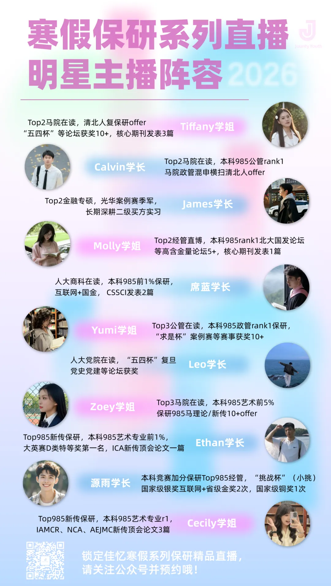 这是寒假固定直播专栏,后续我们还会陆续推出「科研论文写作技巧」「跨专业保研通关攻略」「夏令营vs预推免差异解析」「导师联系避坑指南」等热门主题,每次都会邀请不同专业背景的上岸学长学姐主讲!