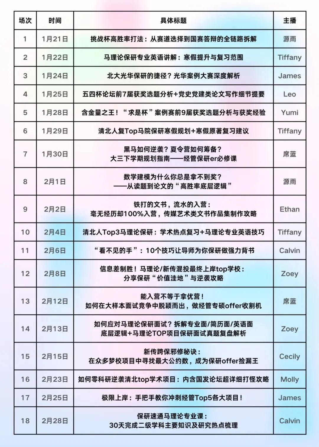 互动福利:每场直播均设置抽奖&互动环节;现场与主播一对一互动交流,进行深度链接;直播间随机掉落惊喜礼品,包含《马理论保研一本通》《保研面试原著题库》等内部绝密资料;累计可免费兑换定制化保研服务,包含“保研1v1规划”“面试原著问答mock辅导”“保研文书修改”等定制化保研服务。