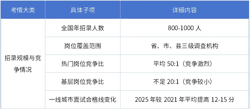 我们在图中可以看到国考统计局岗位面试招录的规模与竞争情况,全国每年大概招800-1000人,岗位覆盖省、市、县三级调查机构。热门岗位基本都是50多个人抢1个名额,有些基层岗位因为要求统计学、经济学、社会学这些专业,竞争相对小一点,但面试分数线一年比一年高。2025年机关岗位的面试合格线,平均比2021年高了12-15分,竞争越来越激烈了,所以大家也要早点准备,充分准备。