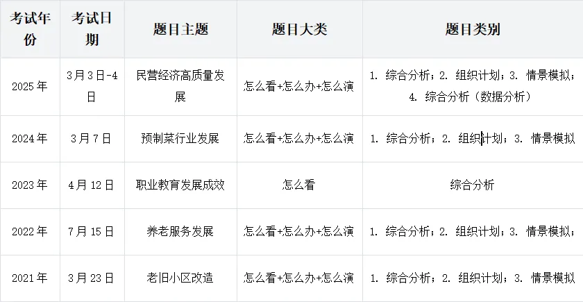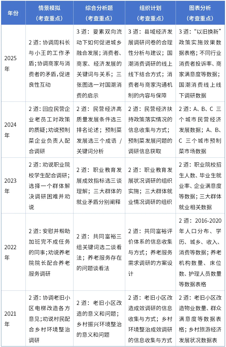 统计局的招录包括国家统计局机关和各地的调查总队,这俩面试是统一出题、流程也一样。近5年考情整体很稳定,只是细节上稍微有点调整,我们一起看一下: