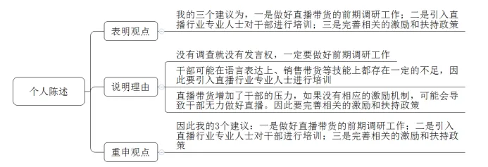 首先拿到题目,先认真看清任务和材料,这一套题的任务一就是我们个人陈述的时候要做的事情,提出对做好干部直播带货的3条建议。而我们也可以从材料中提炼比较重要的关键词,比如:疫情、物流运输受阻、产品滞销、干部直播带货。