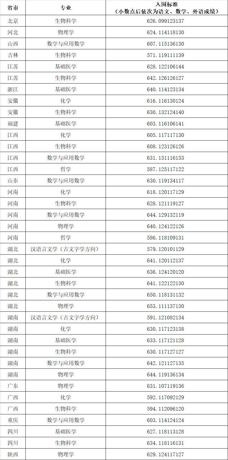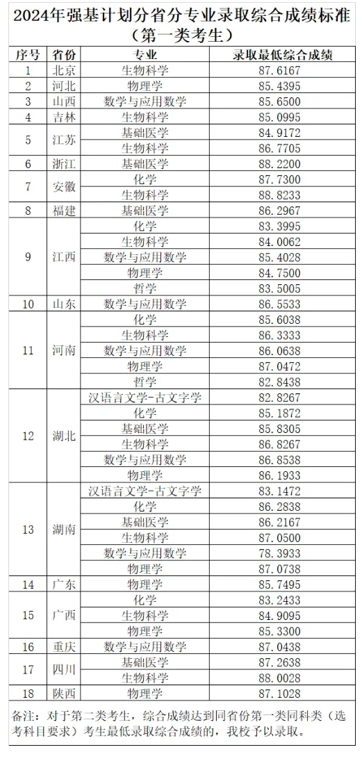 我校已完成2022年强基计划测试工作,根据教育部文件精神和我校招生简章要求,经学校招生工作领导小组审定,现将各省份分专业录取最低综合成绩公布如下:华中科技大学2022年强基计划招生第一类报考条件考生入围校考标准备注:入围分数的小数点后依次为语文、数学、外语成绩。4、强基计划简介