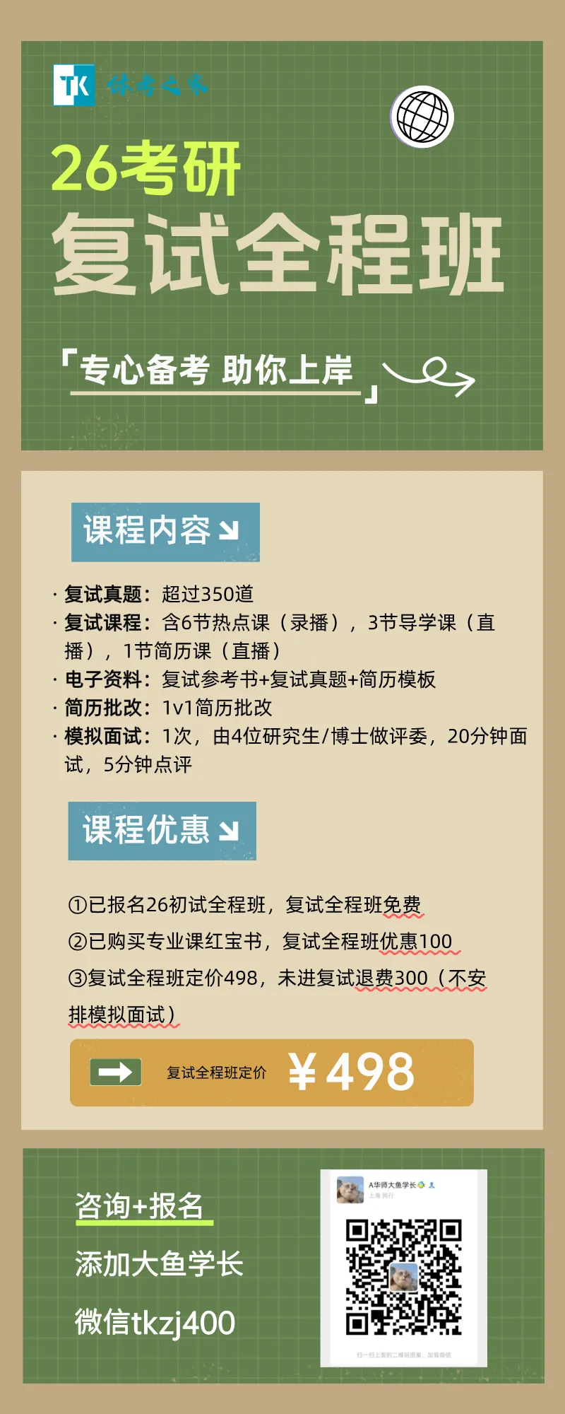 >26复试全程班今晚7点开课,含面试真题350+,不进复试退300