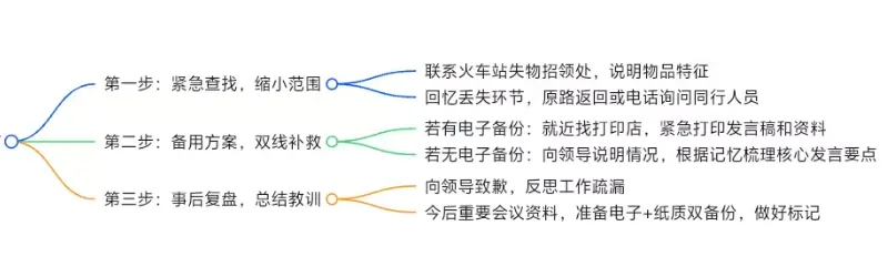 同步启动备用方案,双线补救。若查找后短时间内无法找回,我会立刻向领导如实汇报情况,说明当前状况并致歉,同时提出补救方案:如果发言稿和资料有电子备份(如手机、U盘、云端),我会迅速查找附近的打印店,以最快速度前往打印,打印过程中检查资料的完整性,确保无遗漏;如果没有电子备份,我会向领导说明情况,请求领导给予几分钟时间,根据记忆和工作积累,快速梳理发言稿的核心要点(如工作成果、重点数据、下一步计划等),整理成简洁的发言提纲,同时向领导确认核心观点和关键数据,确保提纲准确贴合发言需求。在此过程中,积极与会议组织方保持沟通,说明情况,若有必要,请求适当调整领导的发言顺序,为补救争取更多时间。