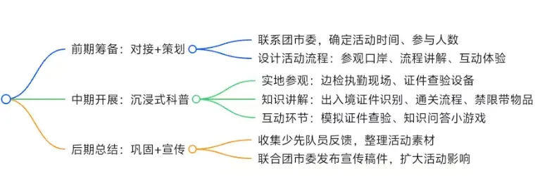 首先是前期筹备阶段,重点做好“对接+策划”。一方面,主动与团市委沟通,明确活动时间、参与少先队员的年龄范围、人数及特殊需求,确定活动时长和集合地点;另一方面,结合边检工作特色设计活动流程,兼顾专业性与趣味性:安排实地参观、流程讲解、互动体验三大环节,提前准备好适合青少年的宣传手册、证件样本、禁限带物品展示模型等物料,同时挑选业务骨干作为讲解员,要求提前打磨讲解语言,用通俗易懂的方式传递知识。此外,还要做好后勤保障,协调执勤现场的安全防护措施,确保活动期间不影响正常边检工作。