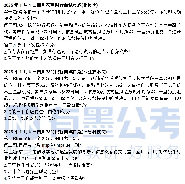 四川农商银行各岗位考查会有一定的差异化,虽然自我介绍和综合题目是较为固定的,但还会问询岗位专业题,在追问环节除了问询考生的个性、经历、求职规划等常规追问外,也会根据岗位情况问询更加针对性强的题目。