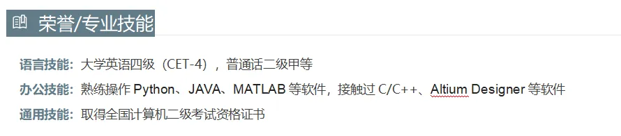 校级/省级/国家级奖项、奖学金及各种荣誉称号按获奖时间、含金量罗列;技能证书包括四六级、雅思、计算机、教师资格证、普通话等。