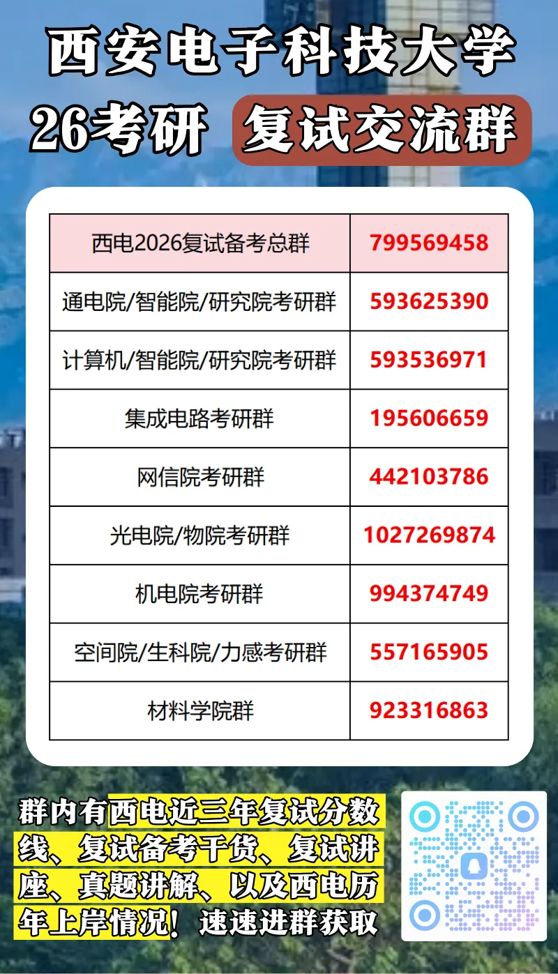 西电27考研交流QQ群:482677263,已经给大家建好啦,群内有西电历年上岸情况汇总,还会有上岸师兄师姐日常考研答疑,想超人一步的宝子可以进群获取哟~