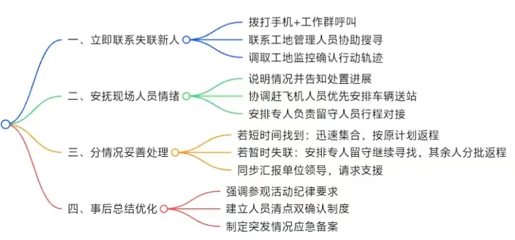 一方面,连续拨打两人手机,在工作群发布呼叫信息;另一方面,迅速联系工地管理人员,请求协助在工地范围内搜寻,并调取监控确认两人行动轨迹,尽快掌握其位置和情况。向大家说明两名新人未到的情况,告知正在全力联系处置,让大家了解进展;对于要赶飞机的人员,协调车辆优先送站,确保其行程不受影响;同时安排专人负责留守人员的行程对接,缓解大家的不满情绪。