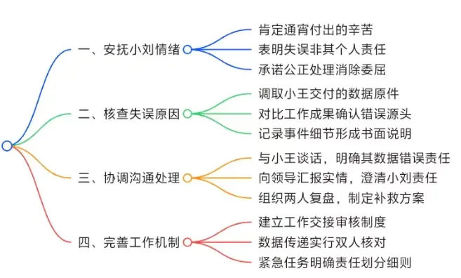 我会第一时间找小刘沟通,充分肯定他通宵完成工作的辛苦付出,明确告知工作失误的核心原因是小王交付的数据错误,并非他的责任,消除他的委屈心理,让他感受到科室的公正与关怀。调取小王交付的数据原件,对比小刘的工作成果,逐一核实错误源头,形成书面说明,确保责任划分有依据、无争议。