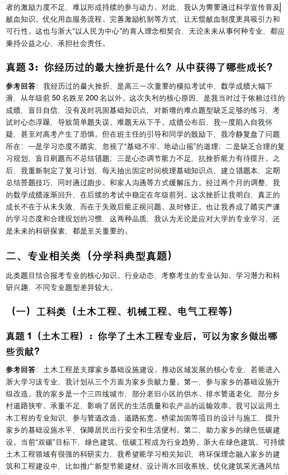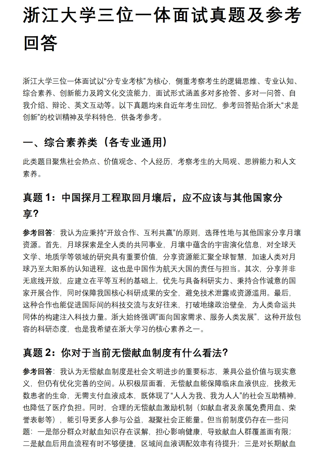 综合类:中国探月取了月壤回来应不应该跟其他国家分享?科技能源类:应不应该大力发展核能?当今光伏发电大力发展为什么还要保留火电?专业应用类:基于当今科技发展,对于农业工程的智慧化改造有什么建议?医学/生物类:大型动物在养殖场患病时要如何处理,从动物和人的角度回答?1、2023-2025年浙江大学三位一体面试真题及解析(含各专业组专项题目)备注:考后时间有限,根据以往通过测试同学经验,针对性的练习往年题目可以起到事半功倍的效果,熟悉考情和题型,协助考生备考。1h 近 3 年真题分类解析(自我认知 / 社会热点 / 专业题等 6 大题型)1h 应答技巧(专业问题拆解逻辑 + 临场应变方法)🎓 师资力量:985/211 院校背景,3 年 + 综评培训经验,部分参与高校面试评审🎁 增值服务:赠《真题汇编》《时政热点集》,课后免费答疑四、 入学与发展:转专业政策与强势学科