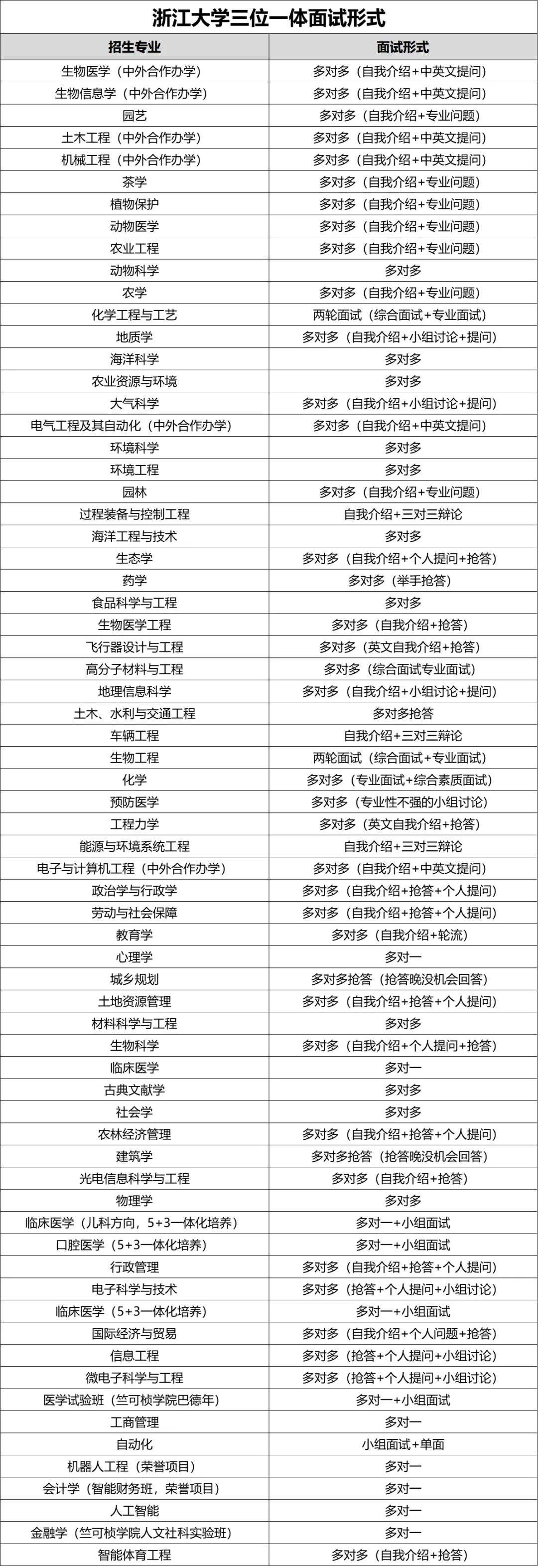 浙大三一考核仅设面试(无笔试),按专业入围,不同专业面试形式不同,核心考察考生的学科素养、逻辑思维、表达能力、专业认知及综合素养;多数专业需涉及中英文双语考核。常见面试形式:多对多(抢答)、多对一、自我介绍、辩论、个人信息问答、专业知识问答(部分专业含英文问答)。(各专业每年形式可能微调,以下为常规参考)02 2025年面试真题分享(核心考点)