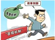 漫画大意:一个小人儿在一个地球上跑,他头顶上写的是“改革创新”,他丢了一个包袱,包袱上面写的是“思想包袱”。小人儿的后面有一只手在推着,手上面写的是“容错机制”。谈谈你对这幅漫画的看法。