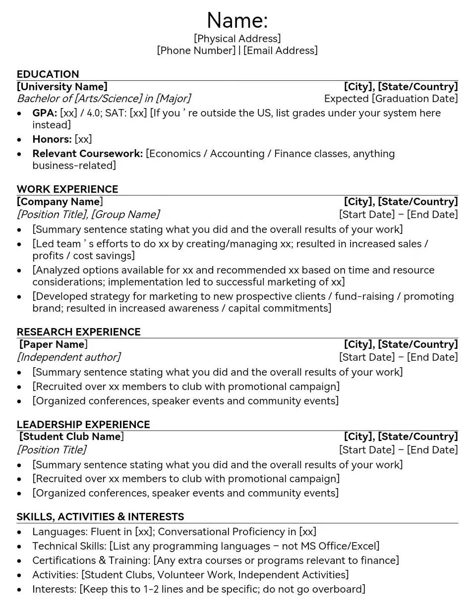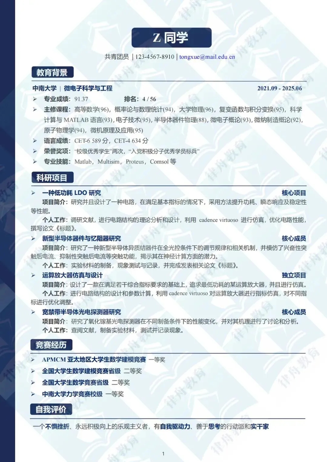 内容:采用倒序时间线,清晰分栏呈现:个人信息、教育背景(GPA/排名)、科研经历、竞赛获奖、实习实践、技能证书等。