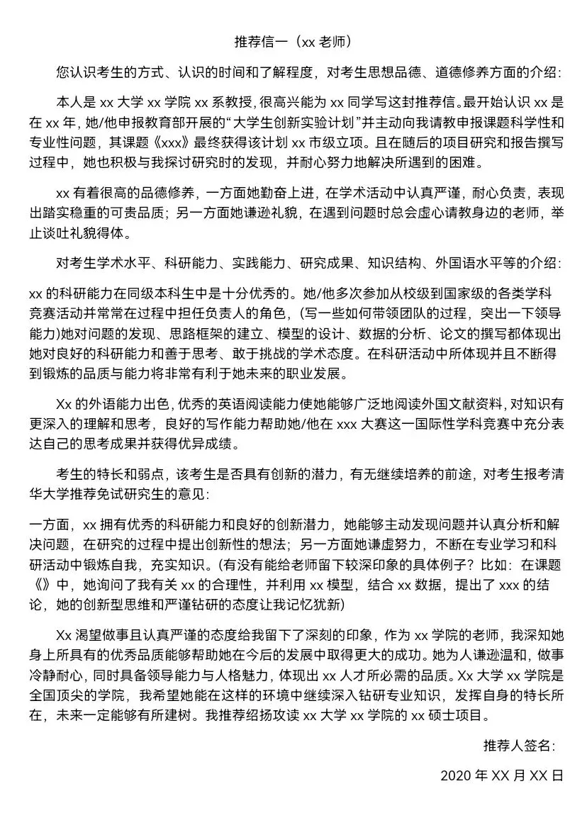 内容:推荐人(导师、任课老师、科研项目指导老师)从他们的视角,证实并评价你的学术潜力、科研能力、学习态度、个人品质等。