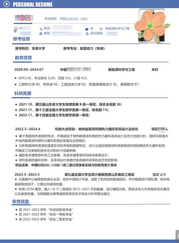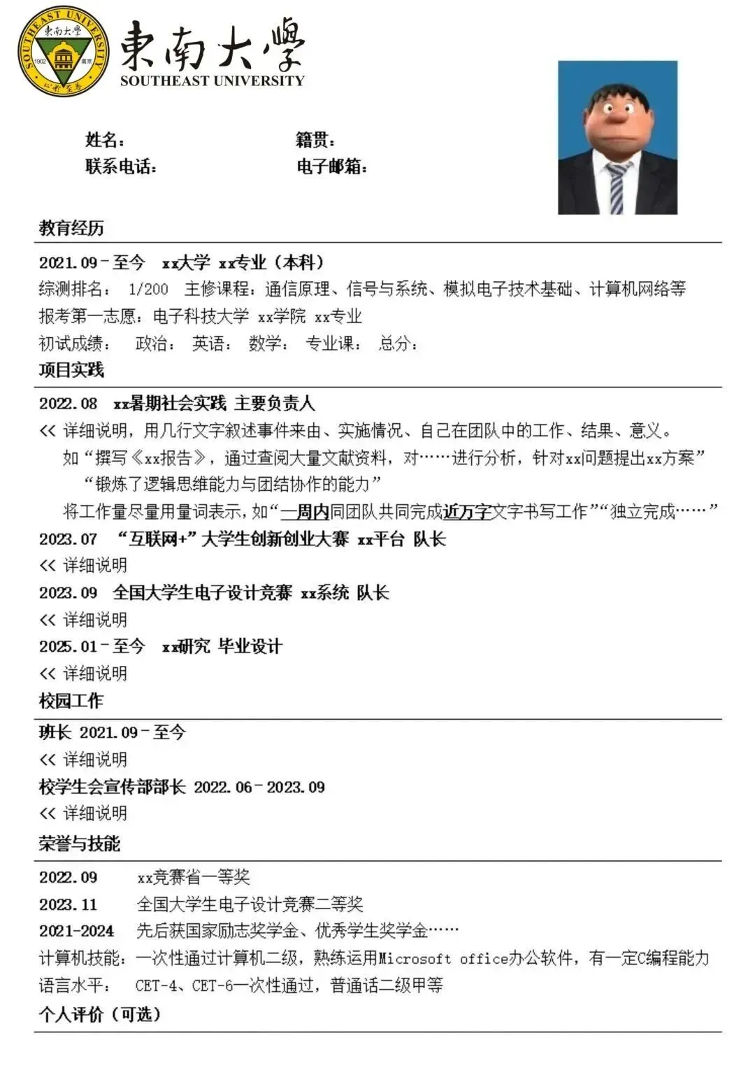 备注:照片使用证件照,干净大方,展现朝气蓬勃、积极向上的模样。基本信息写在最上方,联系方式一定要写正确。