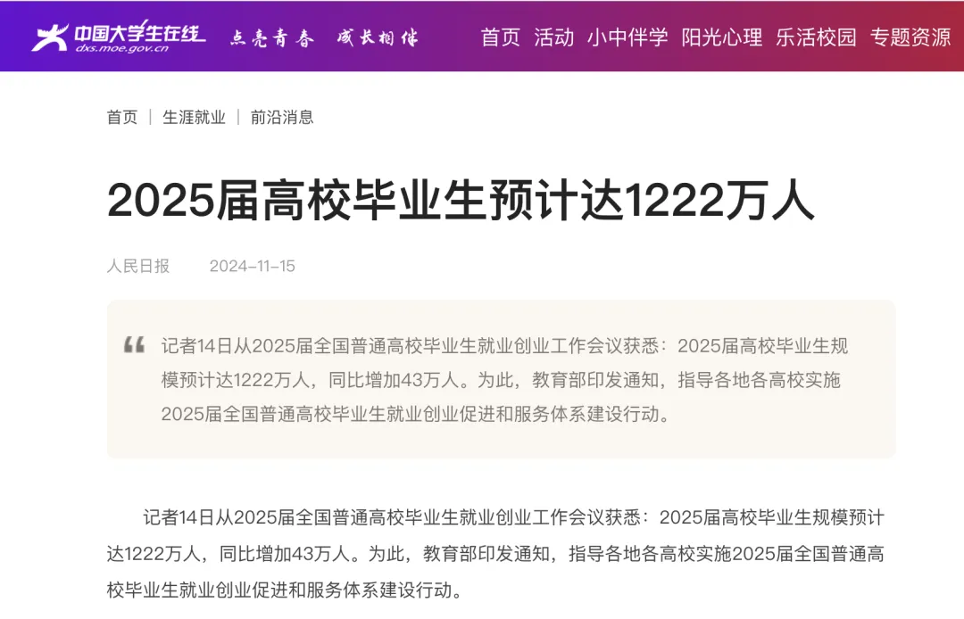 2025年全国高校毕业生规模达1222万人,已经创历史新高了,标注【接受应届生】的岗位数量同比下降18.3%,但简历投递量增长22.7%,有些部分基础岗位竞争比突破50:1。