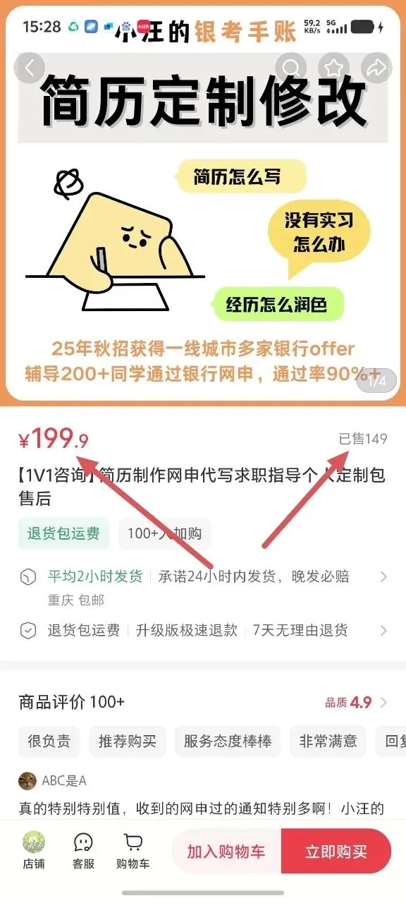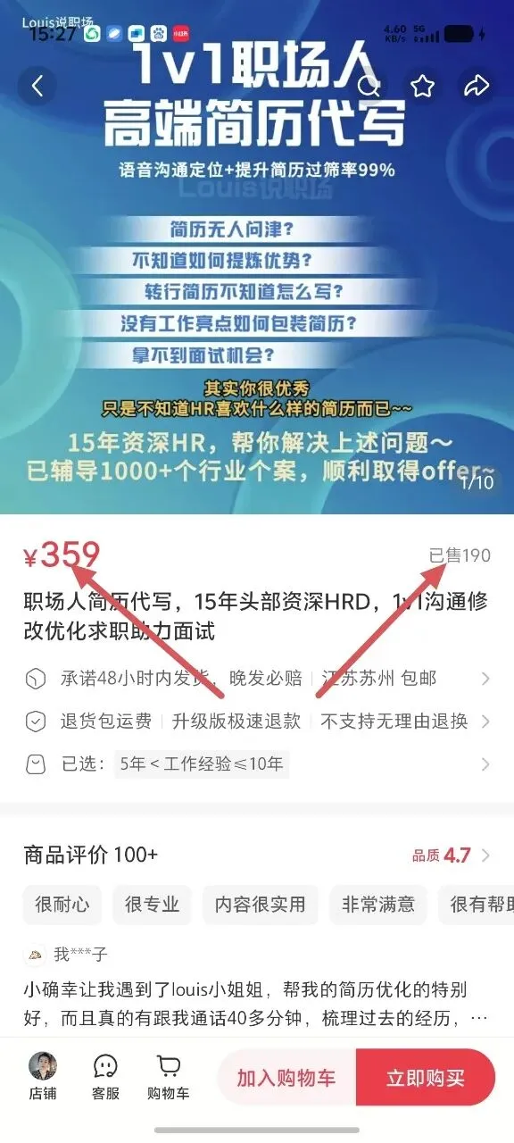我也去搜了一下简历定制,发现,确实有专门的人在做这块,客单价不低,但是,一点也不影响他们的销量,比如下面这2个账号。