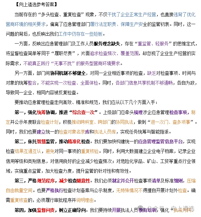 当前,部分应急管理部门在日常检查中存在多头检查、重复检查的问题,对该合并检查的不合并,对已检查合格的事项重复检查,干扰到了企业正常生产经营。对此,你怎么看?(5分钟)