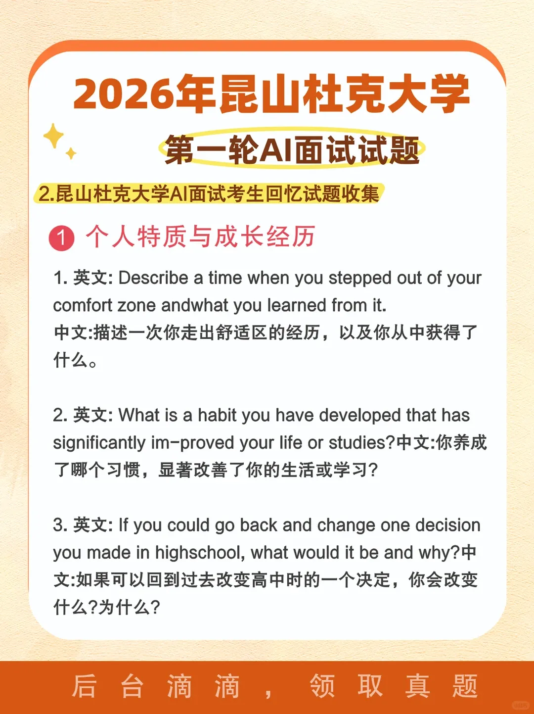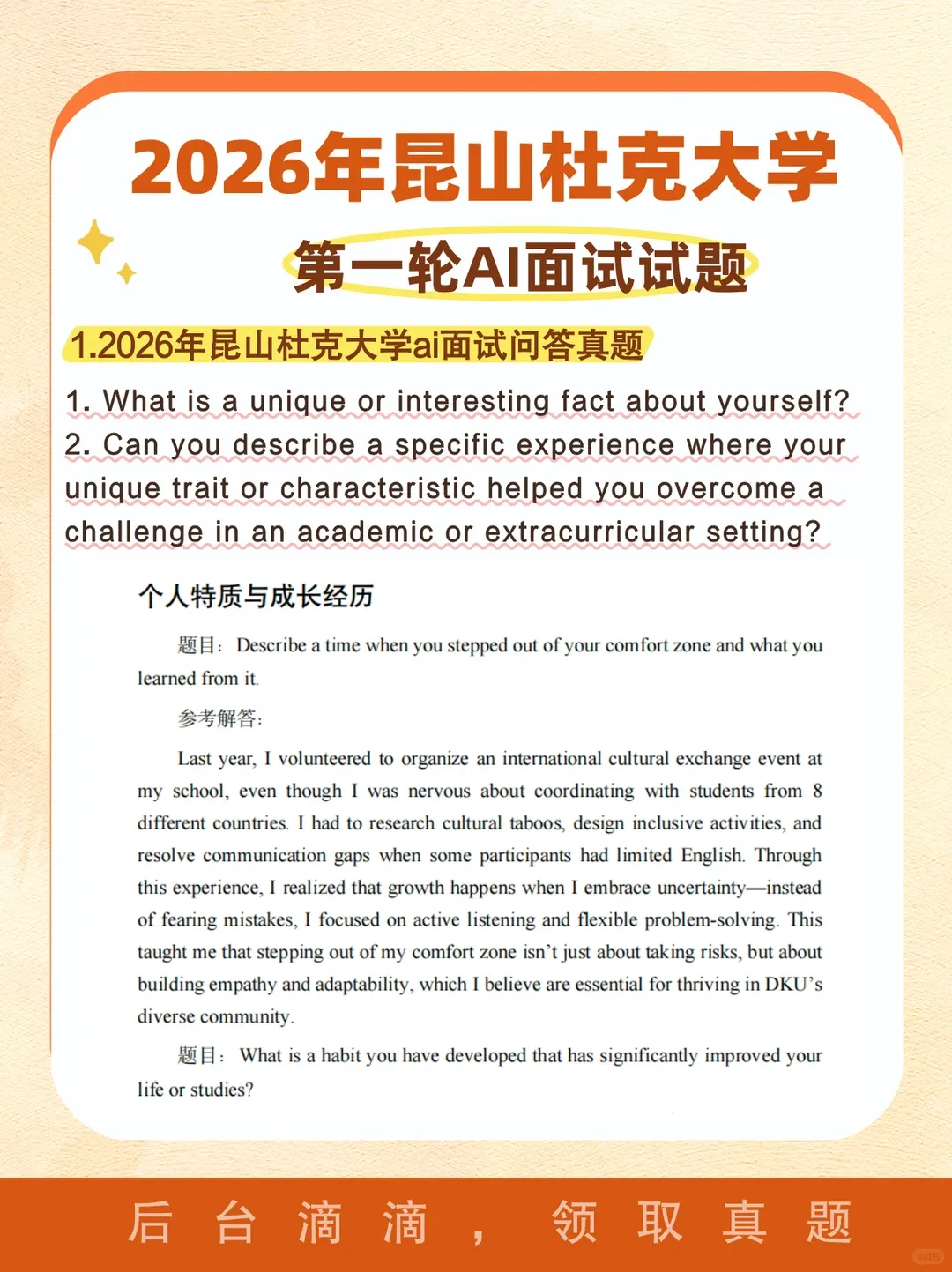 最后,愿每一位备战昆杜的同学,都能借助真题高效备考、吃透流程细节,在AI面试与校园日中展现最佳状态,成功斩获心仪offer🌟校园开放日写作+面试备考资料+专家一对一6小时培训*️⃣一对一授课时间可根据学生进度灵活安排,可拆分为2次或3次*️⃣授课老师均为雅思7分以上,具备丰富的升学英文面试辅导经验*️⃣2025年昆山杜克大学、上海纽约大学英文面试培训通过/降分率达70%程老师 18730705062
