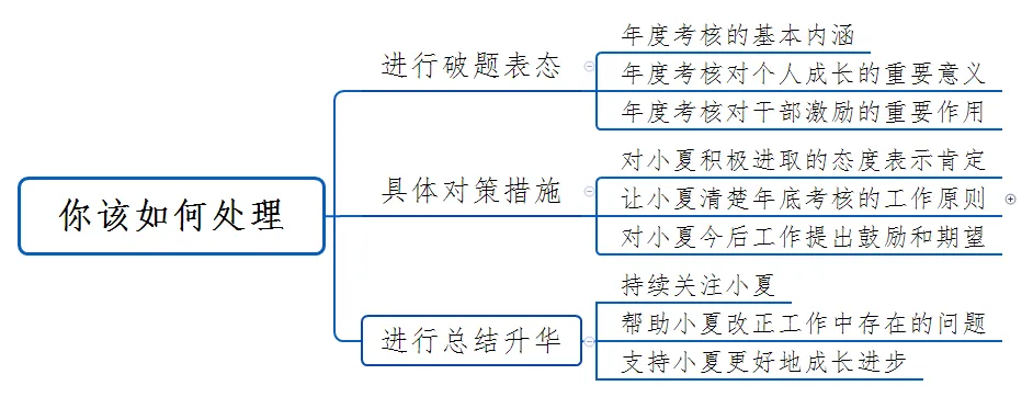 尊敬的各位考官,年度考核作为公务员管理的重要手段,是行政机关根据有关法律、法规及管理权限,按照一定标准、程序和方法,对公务员履行岗位职责,完成工作任务的情况进行定性定量的事实评判和价值评判。对于个人而言,评先评优结果往往直接关系着物质奖励和未来的职业发展机遇。而对领导来讲,如何通过评先评优更好地调动干部工作积极性,也是一道重要课题。作为小夏的领导,面对小夏的诉求,我会做好以下三点: