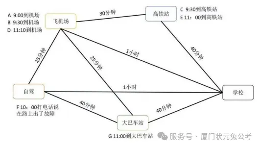 2.学校即将举办一场重要的活动,邀请了七位评委前来参与评审。考虑到评委们 旅途劳累,学校给你分配了两辆车负责接送评委,并且每辆车配备一名熟悉路线 的引导人员,负责与评委沟通和解答疑问。请你根据下图信息,合理规划路线, 制定详细的接送方案,在下午 2 点半之前把评委老师全部送到学校