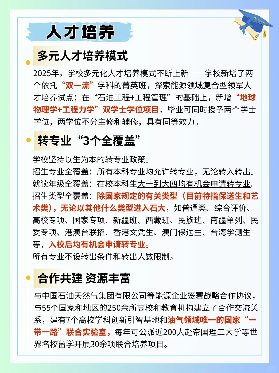 - 转专业政策:石大综评录取后可转专业,政策灵活宽松,580-590分的考生,可通过综评进入211院校,再通过“选课转”“选拔转”转入心仪专业,实现“弯道超车”。