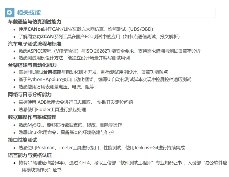 按照熟练程度进行排序,精准匹配招聘岗位描述(JD)中的要求,切勿夸大其词。例如:Python熟练,掌握 Spring Boot;SQL 高级,会使用HIL台架。