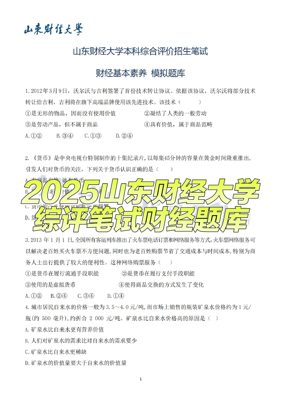 考试科目:2门,分别为「财经基本素养」「财经应用能力」,均为选择题,采用机读卡答题,无主观题题型分值:共56道选择题,其中40道单选(共60分)、16道多选(共40分);多选题选对一个得1分,选多、选错不得分,需遵循“宁少勿多”原则考试时间:6月15日9:00—11:10,考试开始15分钟后不得入场,考试结束前不允许交卷离场考试地点:山东财经大学燕山校区或章丘校区,网上确认时自动分配,以准考证为准考察侧重:以政治类题目为主,融入财经相关内容,涉及财经基本概念、经济学原理、简单数据分析,同时兼顾基础文化素养,文科生相对有优势,但理科生也可通过针对性积累冲刺高分2. 笔试高频真题(含解析+备考方向)