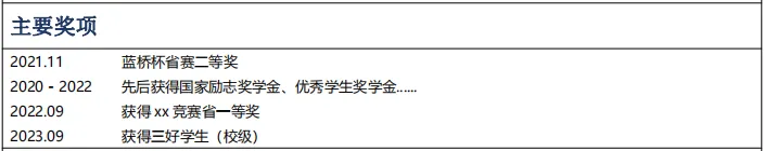 校级/省级/国家级奖项、奖学金及各种荣誉称号按获奖时间、含金量罗列;技能证书包括四六级、雅思、计算机、教师资格证、普通话等。