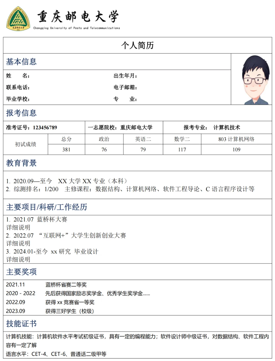 下面是按照重庆邮电大学研究生复试及录取办法给出的个人简历模板补充,大家可以参考。