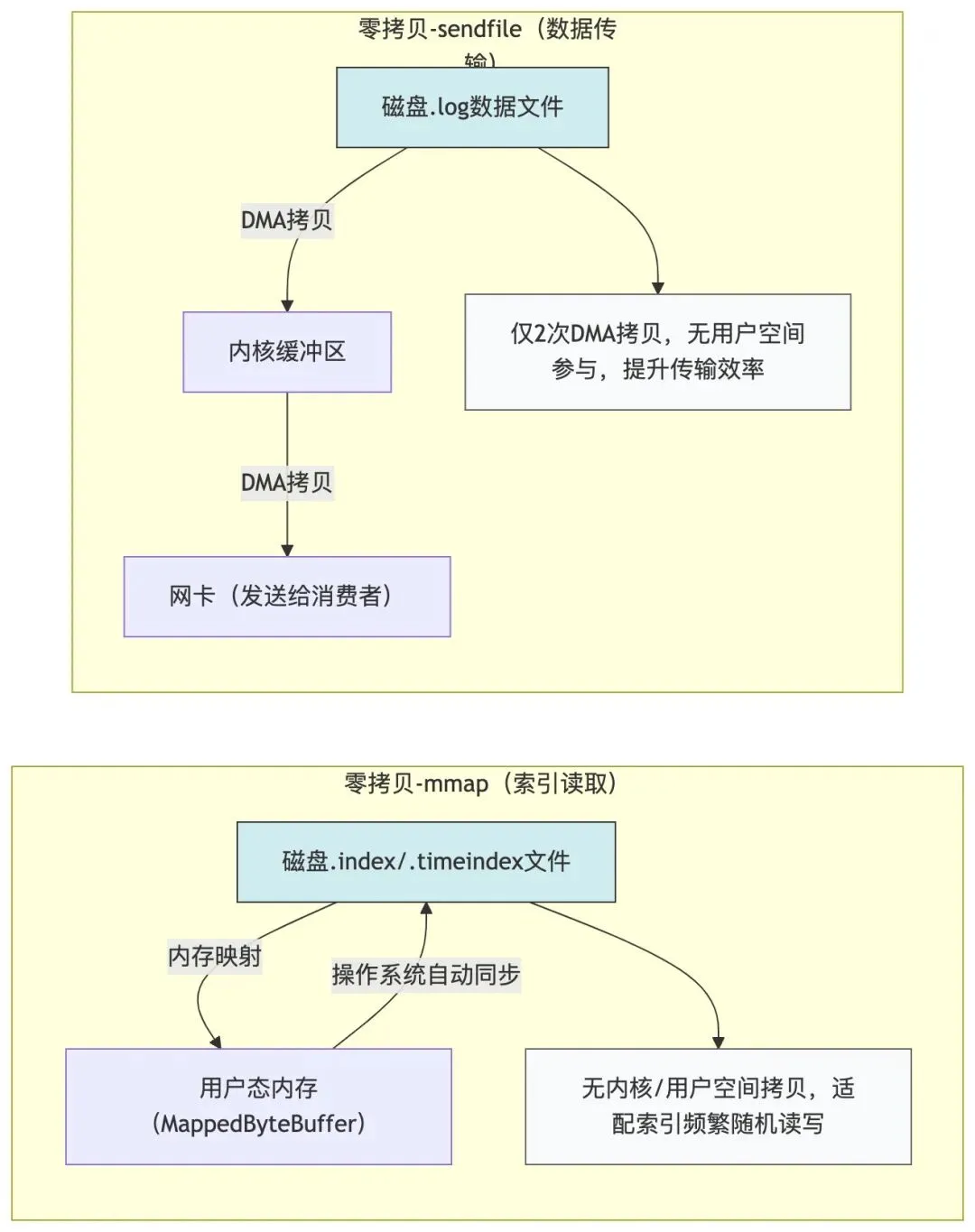 mmap 内存映射:用于索引文件的读取。Kafka 的.index 和.timeindex 文件使用 MappedByteBuffer 实现内存映射,将文件直接映射到用户态的内存地址空间。对这块内存的读写,操作系统会自动同步到磁盘文件,速度极快。这种方式特别适合索引文件的频繁随机读写(二分查找消息位置)场景。