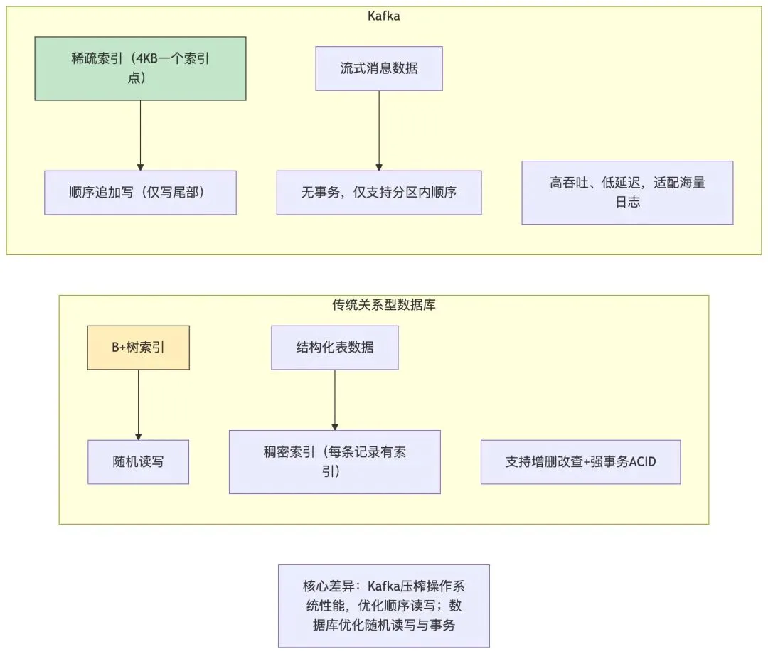 Kafka 的存储模型与传统数据库存在本质差异,这种差异决定了两者在不同场景下的适用性: