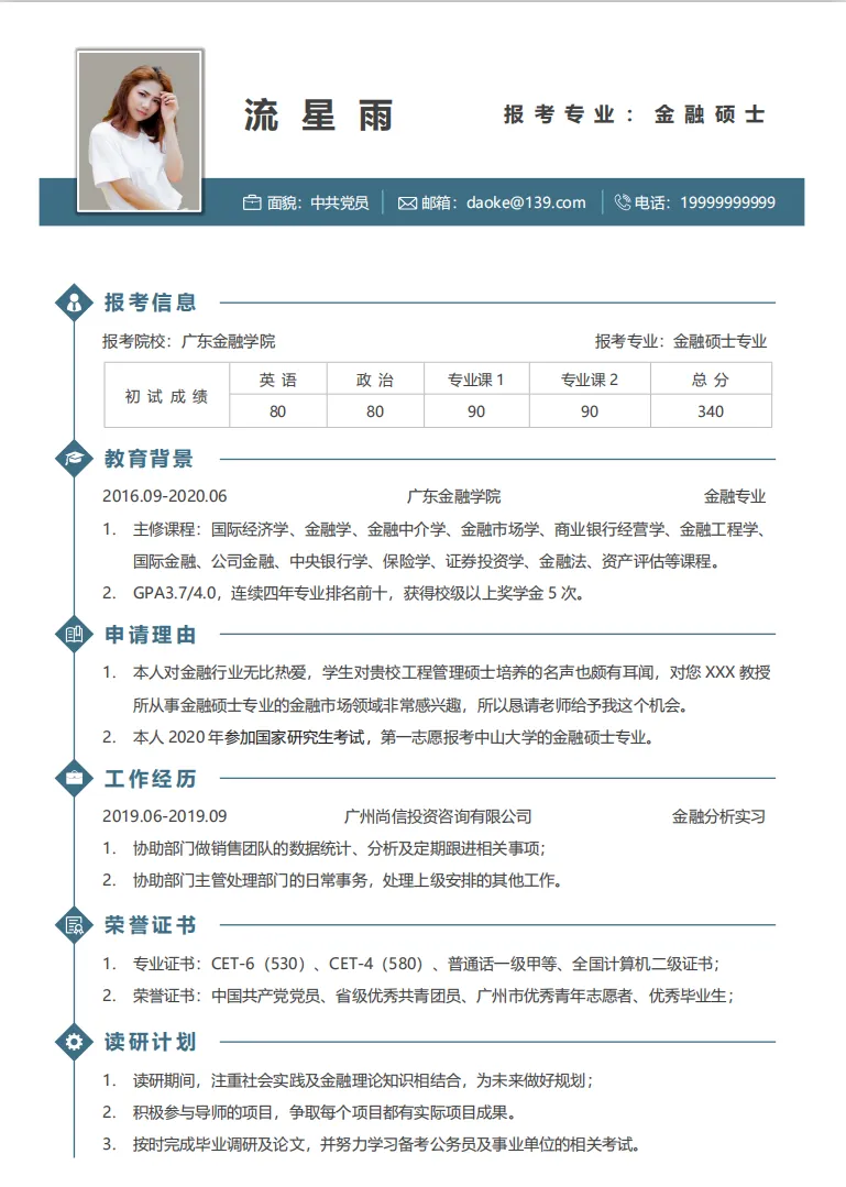 一份好的简历应该简洁明了,突出重点。一般来说,考研复试简历的结构包括以下几个部分: