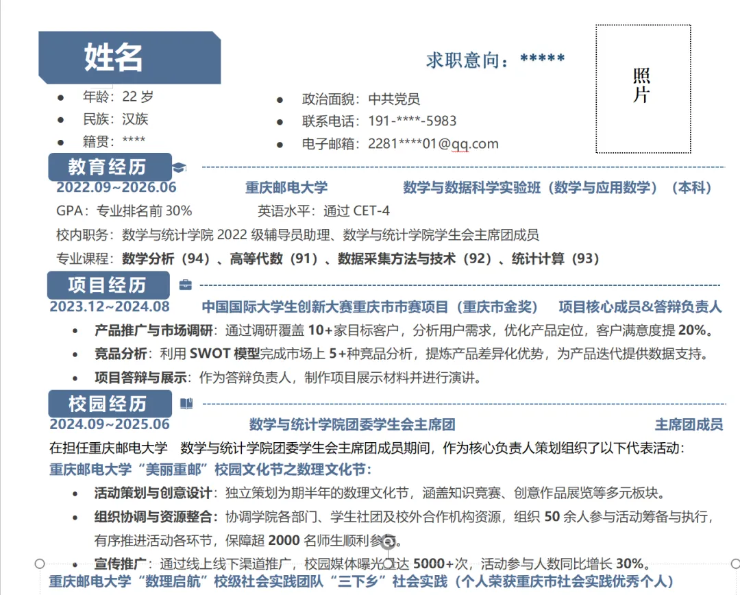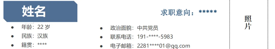 准确填写姓名、求职意向、联系电话、电子邮箱等核心联络信息,求职意向结合专业与规划精准明确;政治面貌、年龄、籍贯、校内职务等按需补充,信息真实、排版规整,方便快速抓取关键内容;照片记得用证件照更显职业化。