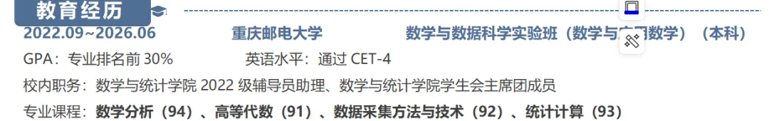 准确填写院校、专业、就读时段;重点标注GPA、专业排名、英语等级、技能证书进度,核心高分课程标注分数单独列出,(对于不突出的可以避重就轻,优先展示好的一面)清晰体现专业学习功底与学术积累