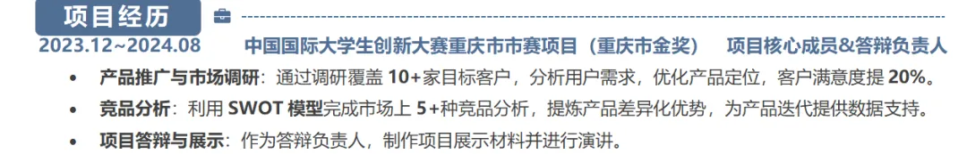 时间倒序列出课程项目、各级竞赛,明确个人角色与分工;详细描述工作内容,用可量化数据呈现成果,如覆盖人数、完成效率、获奖等级,突出个人能力与实际贡献。