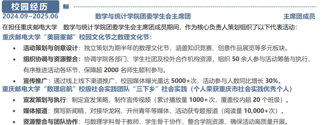 梳理班委、学生会、社团任职及三下乡、志愿服务等经历,时间倒序呈现;聚焦策划组织、协调沟通等核心工作,提炼锻炼的能力,用数据体现活动成果,如参与规模、宣传曝光量,拒绝空泛表述。