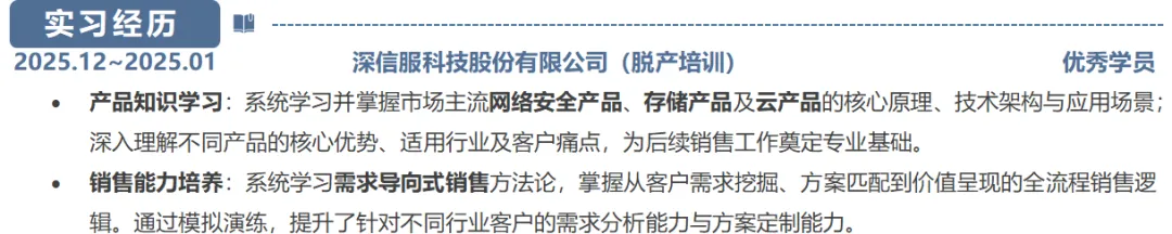 注明单位、时段、个人身份,记录实训、培训、正式实习等经历;总结所学专业知识、实操技能与行业认知,梳理工作逻辑和落地方法,体现岗位适配能力与实操经验。