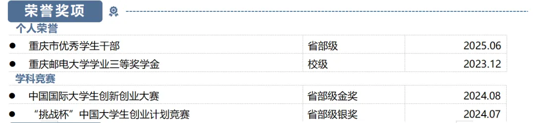 按国家级/省部级/校级等级+时间倒序整理,分学业、竞赛、实践、综合类标注;清晰写明奖项名称、颁发单位与获得时间,直观展现荣誉含金量与个人综合实力。